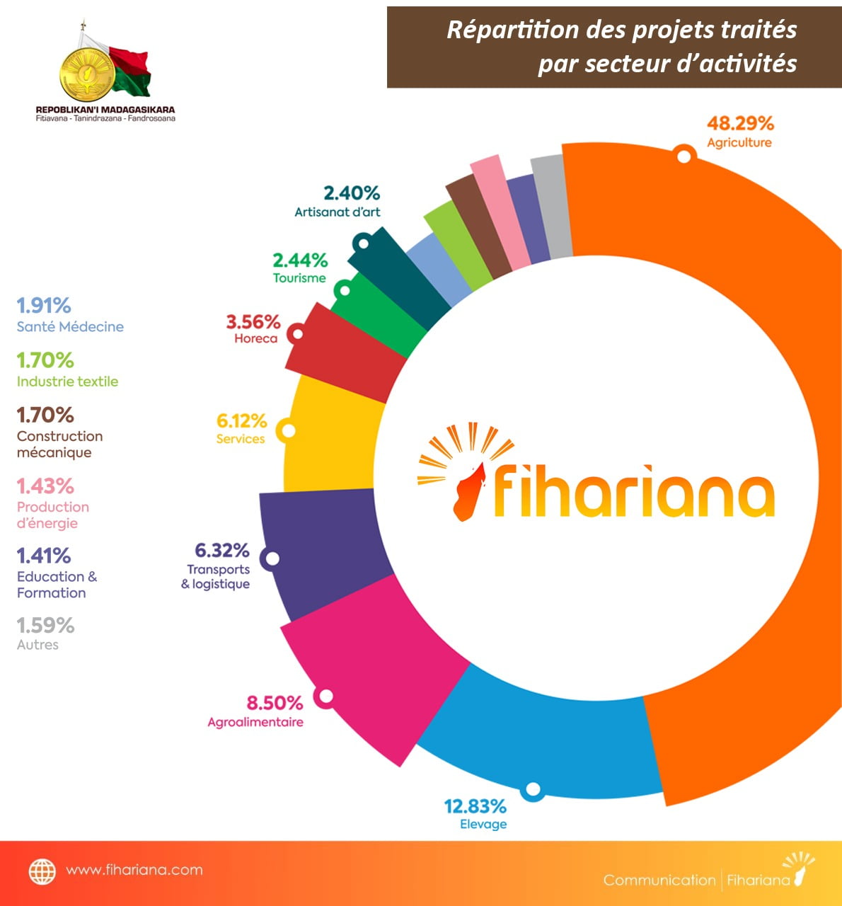 The files processed in 2019 by the Fihariana program enabled the breakdown below to be released. Since its launch in February 2019, the Fihariana program has supported entrepreneurs and project leaders from all sector of activity. 48.29% of the projects received by Fihariana come from the agricultural sector, a very promising sector in Madagascar which employs 80% of the active population and constitutes an essential component of the Malagasy economy by contributing up to 30% to the GDP. With 12.83%, livestock is in second position. Indeed, many breeders are also enrolling in the program in order to increase their monthly or even annual income, but also with the aim of meeting national and international market standards and ensuring the country’s food and financial security. The program prioritizes agriculture and livestock as a lever for the country’s development. It should be noted that the Akoho nakà project is part of this branch, and whose registration still remains open on the Fihariana site, with the Chambers of Commerce and Industry of each region, and with regional delegates.